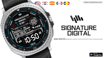 O SamWatch Signature Digital é um mostrador de relógio digital projetado para dispositivos Wear OS, oferecendo uma interface que combina elementos tradicionais e modernos. Entre suas principais funcionalidades, destacam-se a exibição da fase da lua, contador de passos, monitoramento da frequência cardíaca e rastreamento de distância, permitindo que os usuários monitorem suas atividades diárias de forma eficaz. Além disso, o mostrador inclui informações meteorológicas e status da bateria, mantendo os usuários informados sobre suas condições e desempenho.
